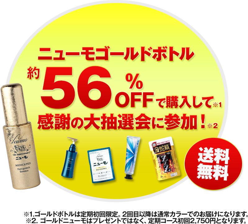 Aゴールドボトルは、過去に通常のニューモを購入頂いた方も、もう一度56%オフでご購入頂けます。但し、既にゴールドボトルをご購入頂いた方は対象外となります。