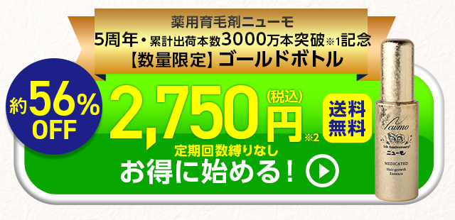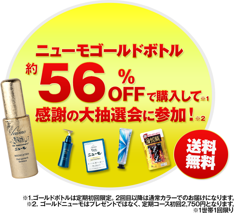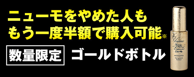 Aゴールドボトルは、過去に通常のニューモを購入頂いた方も、もう一度56%オフでご購入頂けます。但し、既にゴールドボトルをご購入頂いた方は対象外となります。
