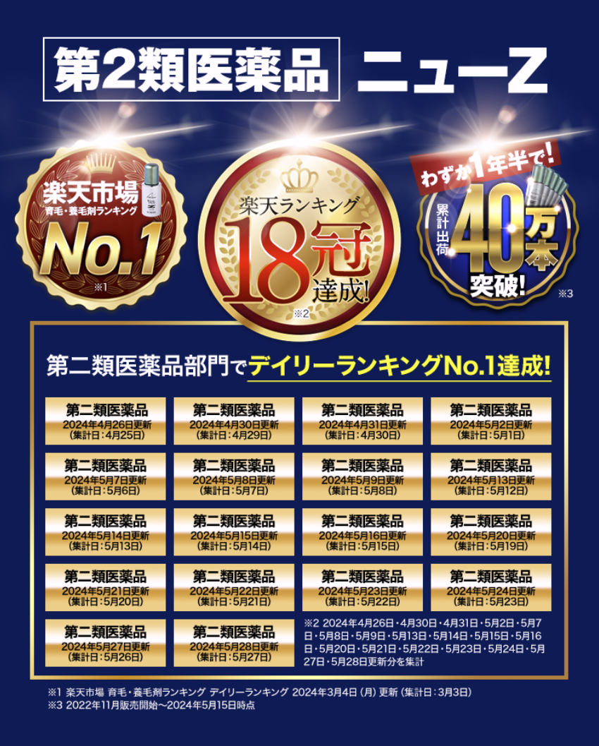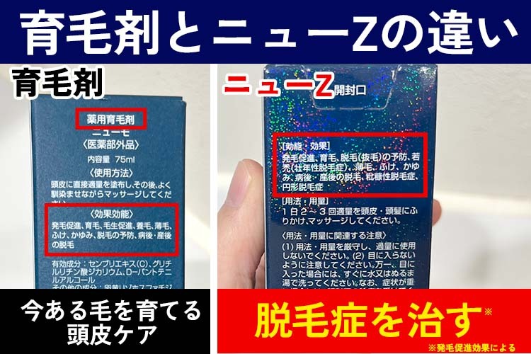 - A最大の違いは「効果」です。育毛剤は「今ある毛を育てる」働きがあります。対して、「ニューZ」は若禿や粃糠性脱毛症、円形脱毛症を治療する「医薬品」です(※発毛促進効果による)